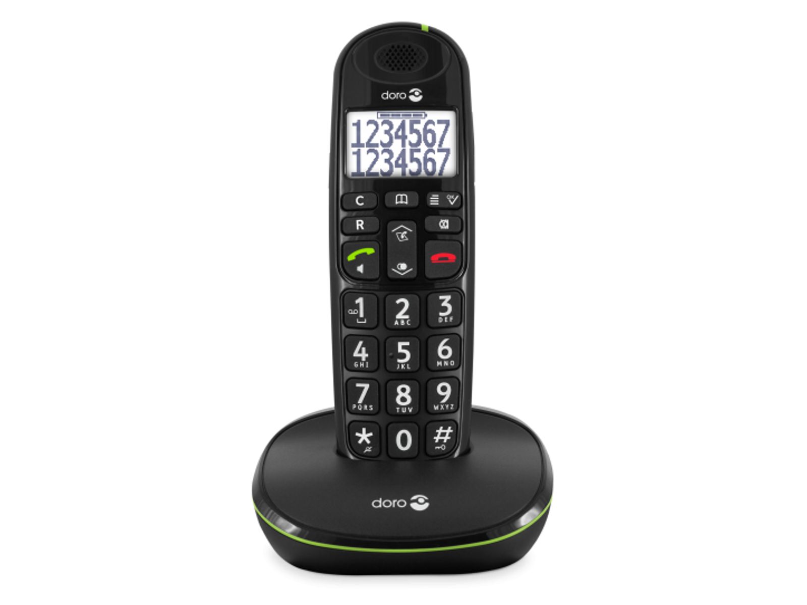 Doro PhoneEasy® 110 is een zeer gemakkelijk te lezen draadloze telefoon, dankzij het verlichte scherm met ultrahoog contrast dat de volledige namen en nummers weergeeft, zonder rollende tekst. Met de grote, sprekende cijfertoetsen wordt het gemakkelijker om nummers te kiezen en de Doro TrueSound kwaliteit garandeert een goed, helder geluid voor aangenamere gesprekken. Heeft ook een luidspreker met hoog volume.