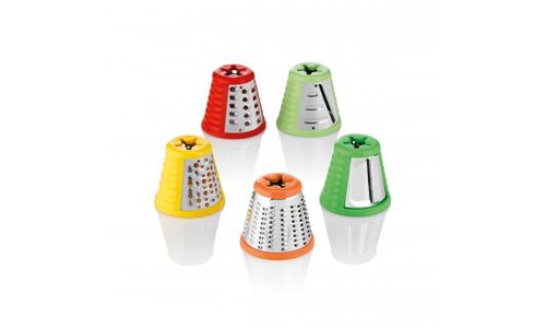 5 kegels = 5 kleuren = 5 functies: fijn raspen, grof raspen, fijn snijden, afkrabben