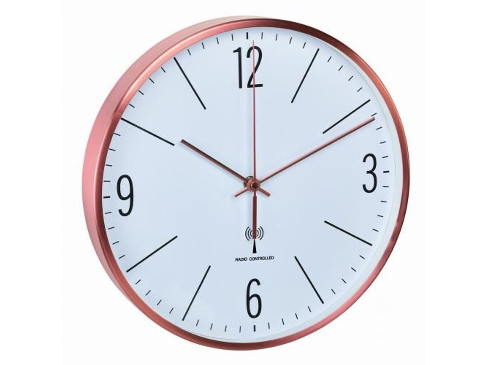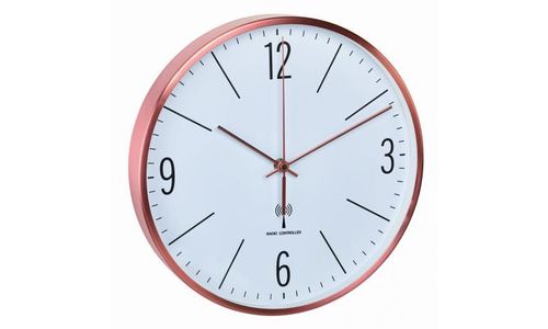 Deze wandklok heeft een koper kleurige omlijsting.