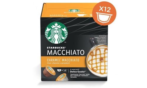 Elke doos bevat 6 koffie- en 6 melkcapsules voor NESCAFÉ® Dolce Gusto® capsulemachines, waarmee je 6 kopjes STARBUCKS Caramel Macchiato by NESCAFÉ Dolce Gusto kunt maken.