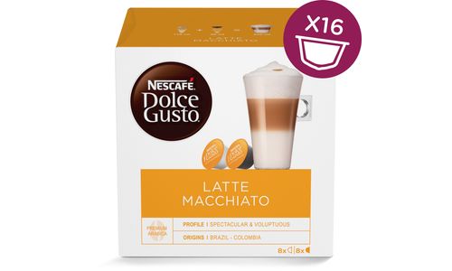 Elke doos bevat 8 koffie- en 8 melkcapsules voor NESCAFÉ® Dolce Gusto® capsulemachines, waarmee je 8 kopjes Latte Macchiato kunt maken.