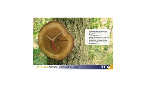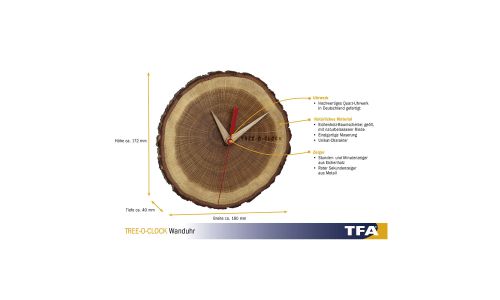 Deze originele en karaktervolle klok van TFA is handgemaakt van een geoliede eikenhouten schijf met zijn natuurlijke schors. Elk stuk is uniek door de natuurlijke eigenschappen van hout.