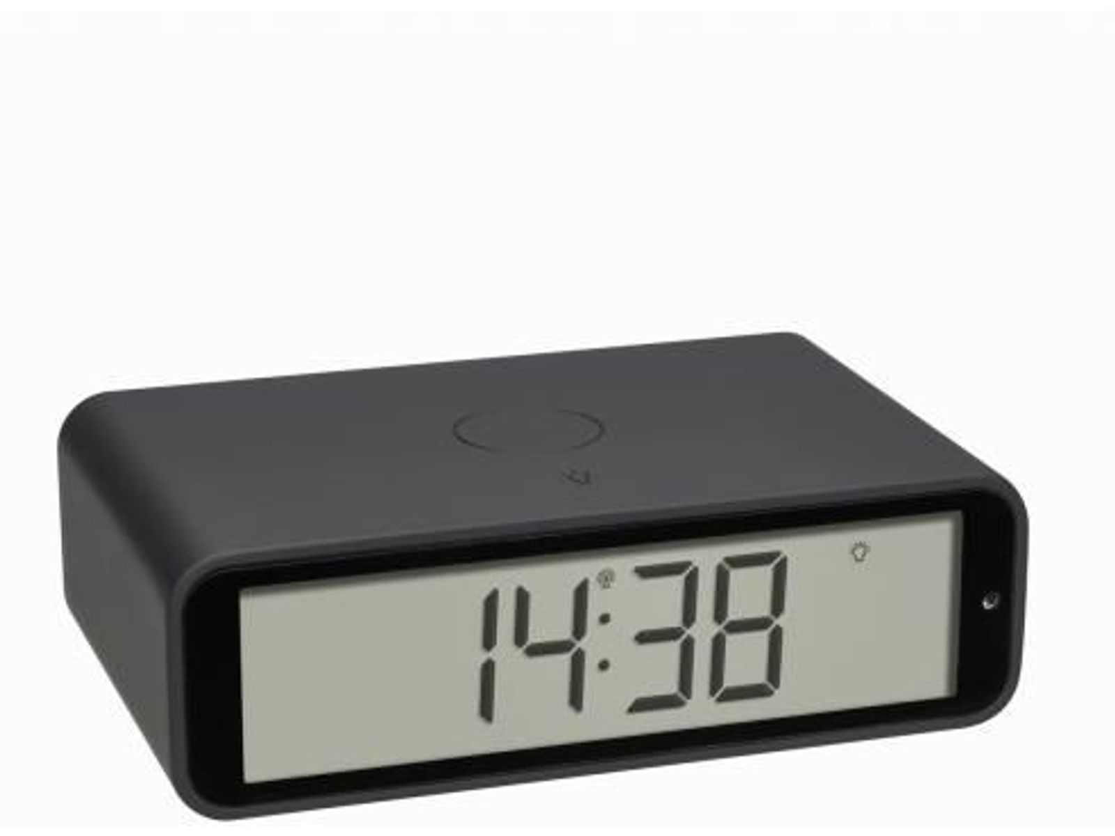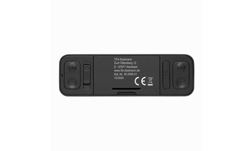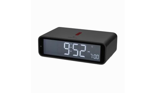 Alarm Clock, Radio Controlled, Table Clock Dimensions (L) 117 x (B) 71 x (H) 37 mm Batteries 2 x AA 1.5 V Flat, elegant design with matt rubberised surface Activation of the alarm by 180 degree rotation Inverted, negative display backlight Automatic backlight at night Alarm with adjustable snooze duration