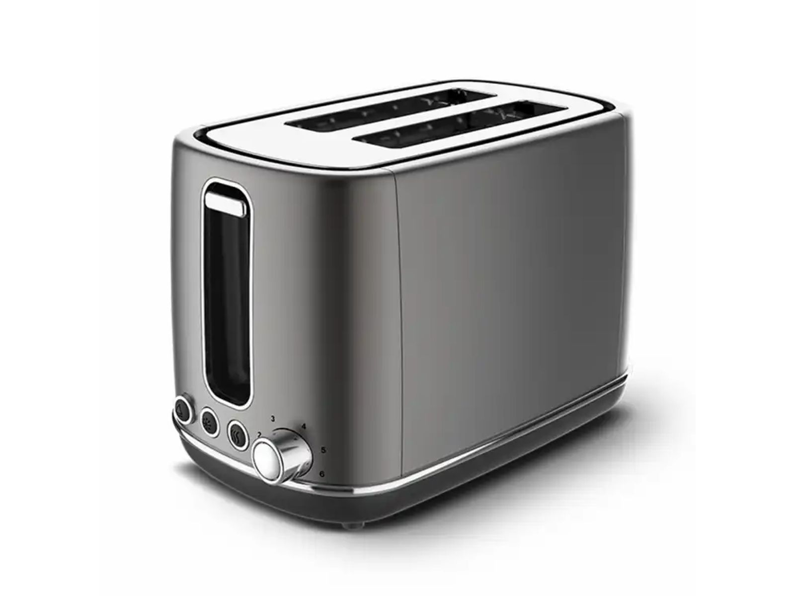 Un grille-pain en acier inoxydable dans une élégante finition grise et mate au design intemporel.