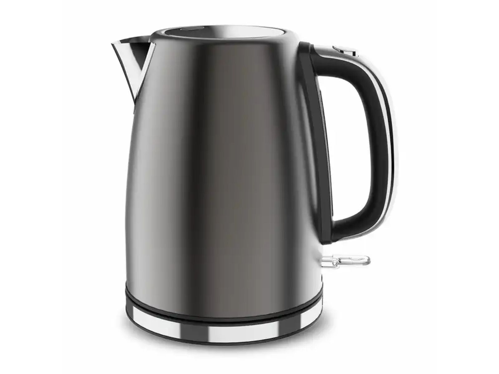 Une bouilloire en acier inoxydable dans une élégante finition grise et mate au design intemporel.