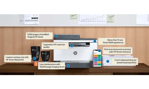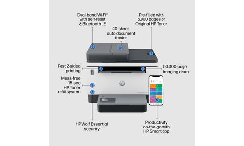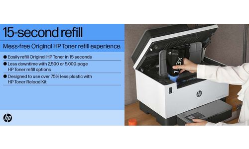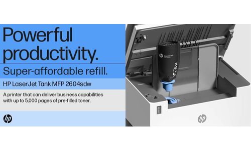 HP LaserJet Tank MFP 2604sdw printer, Zwart-wit, Printer voor Bedrijf, Dubbelzijdig printen; Scannen naar e-mail; Scannen naar pdf. Printtechnologie: Laser, Printen: Afdrukken in kleur, Maximale resolutie: 600 x 600 DPI. Kopiëren: Kopiëren in kleur, Maximale kopieerresolutie: 600 x 1200 DPI. Scannen: Scannen in kleur, Optische scanresolutie: 600 x 600 DPI. Duplex functies: Printen, Kopiëren. Maximale ISO A-series papierformaat: A4. Wifi. Direct printen. Kleur van het product: Zwart, Grijs