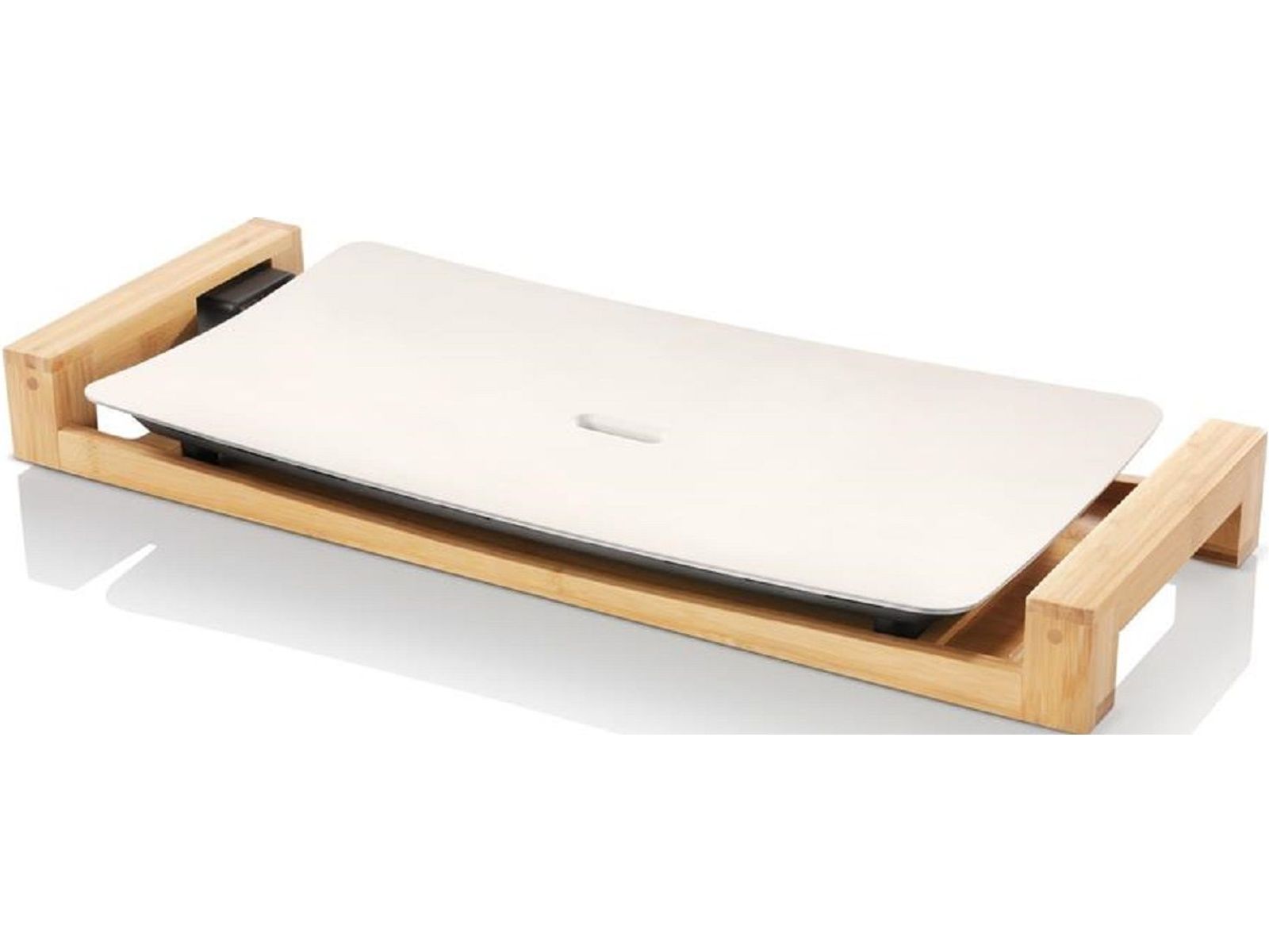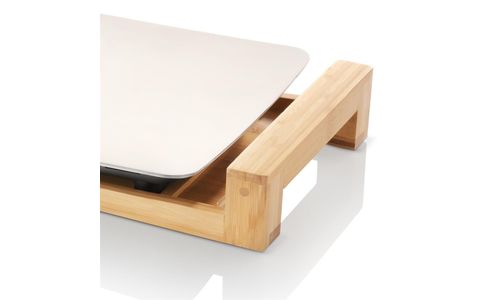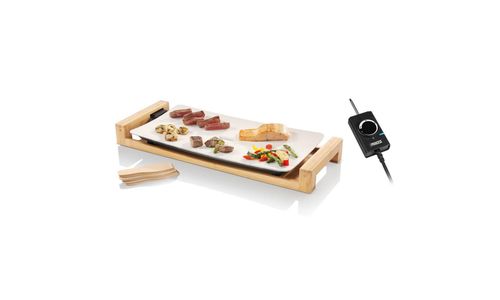 Bijzonder luxe bakplaat afgewerkt met bamboe. Welving in de plaat zorgt dat het voedsel perfect in contact blijft met het geïntegreerde verwarmingselement van 2500 watt. Dankzij de ruime afmeting van 50 x 25 cm is er genoeg ruimte voor 6 personen.