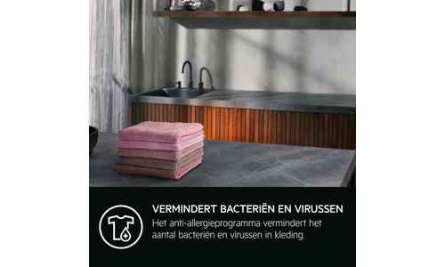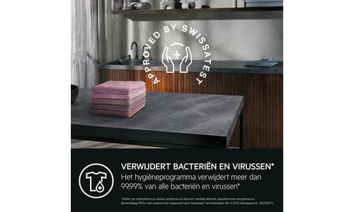 Het hygiëneprogramma, gecertificeerd door Swissatest, is een hoogwaardige wascyclus die meer dan 99,99% van alle bacteriën en virussen* uit kleding verwijdert. Door op temperaturen hoger dan 60 °C te wassen, kun je ook allergenen verminderen.