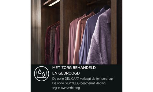 Wollen truien, katoenen T-shirts, zakelijke overhemden - de kleding die u dag in, dag uit draagt - hebben speciale verzorging nodig zodat ze ook speciaal blijven aanvoelen. Met AEG SensiDry®-technologie worden droogtijden ingekort en wordt de temperatuur laag gehouden, zodat kleding nooit wordt blootgesteld aan onnodige hitte. Dit zorgt ervoor dat de kledingstukken die u vaak draagt elke dag weer ogen en aanvoelen als nieuw.