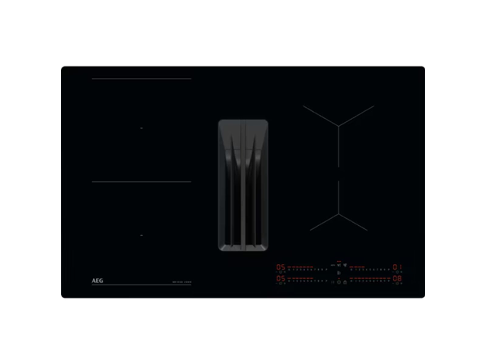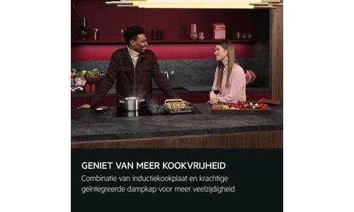 De Bridge-kookplaat met afzuiging past in een kast van 60 cm. De kookplaat combineert een inductiekookplaat met een krachtige ingebouwde dampkap voor een optimale dampafzuiging. De brugfunctie voegt twee kookzones op dezelfde temperatuur samen, ideaal voor grotere pannen of plancha-grills.