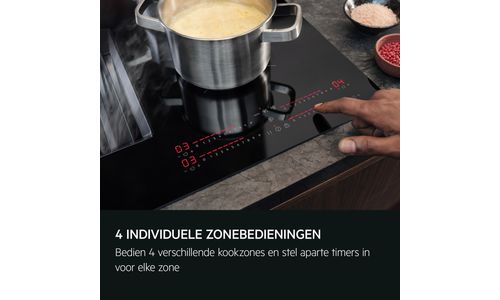 4 individuele zone-bedieningselementen met 9 vermogensniveaus stellen je in staat om 4 verschillende kookzones te bedienen en voor elk aparte timers in te stellen. Andere functies zijn boosterfunctie, DirekTouch, kinderslot en automatische regeling van de afzuiging.